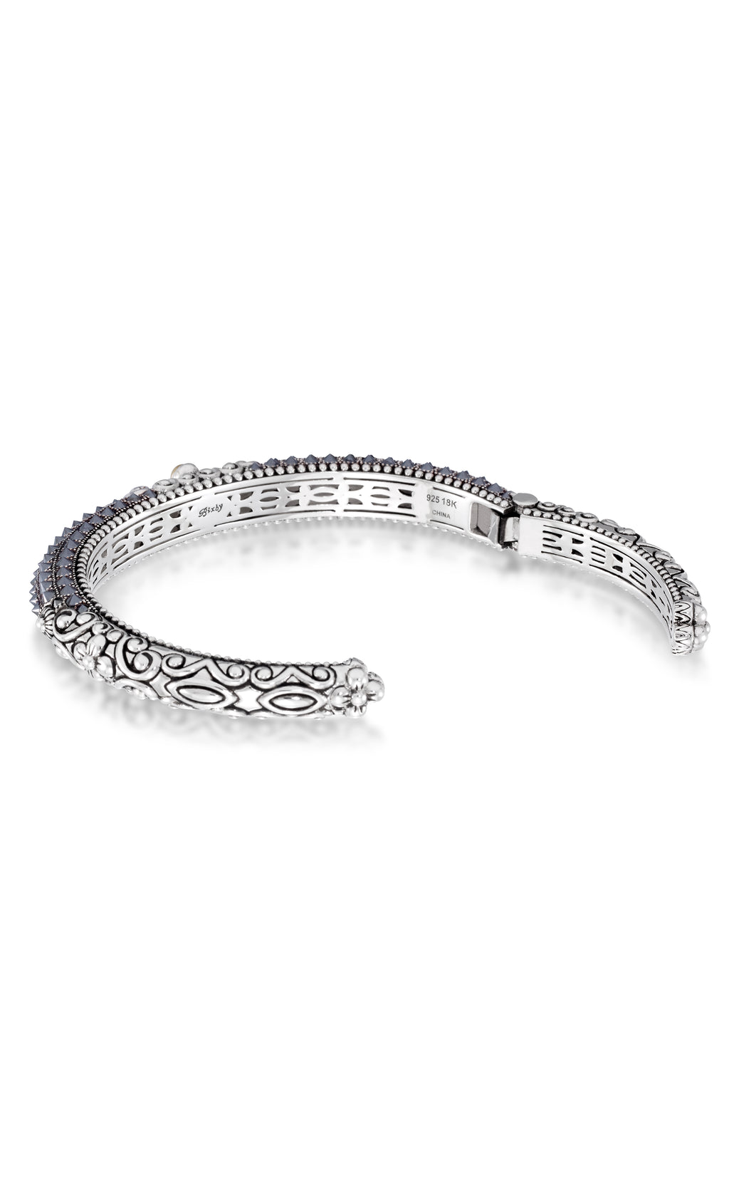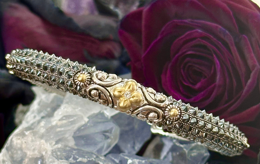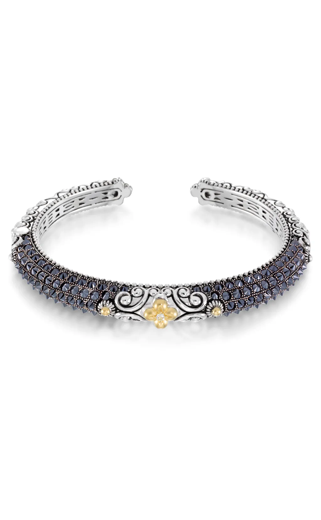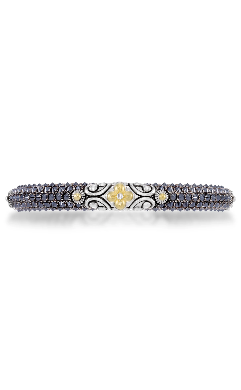 Upside down hematite sparkles with 18K yellow gold signature flower and white topaz stationed in the center; signature carvings and 18K gold beads on either side.