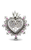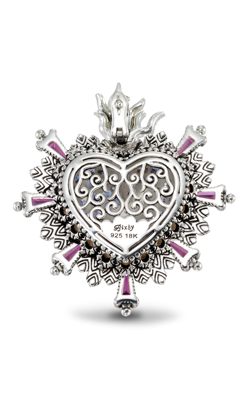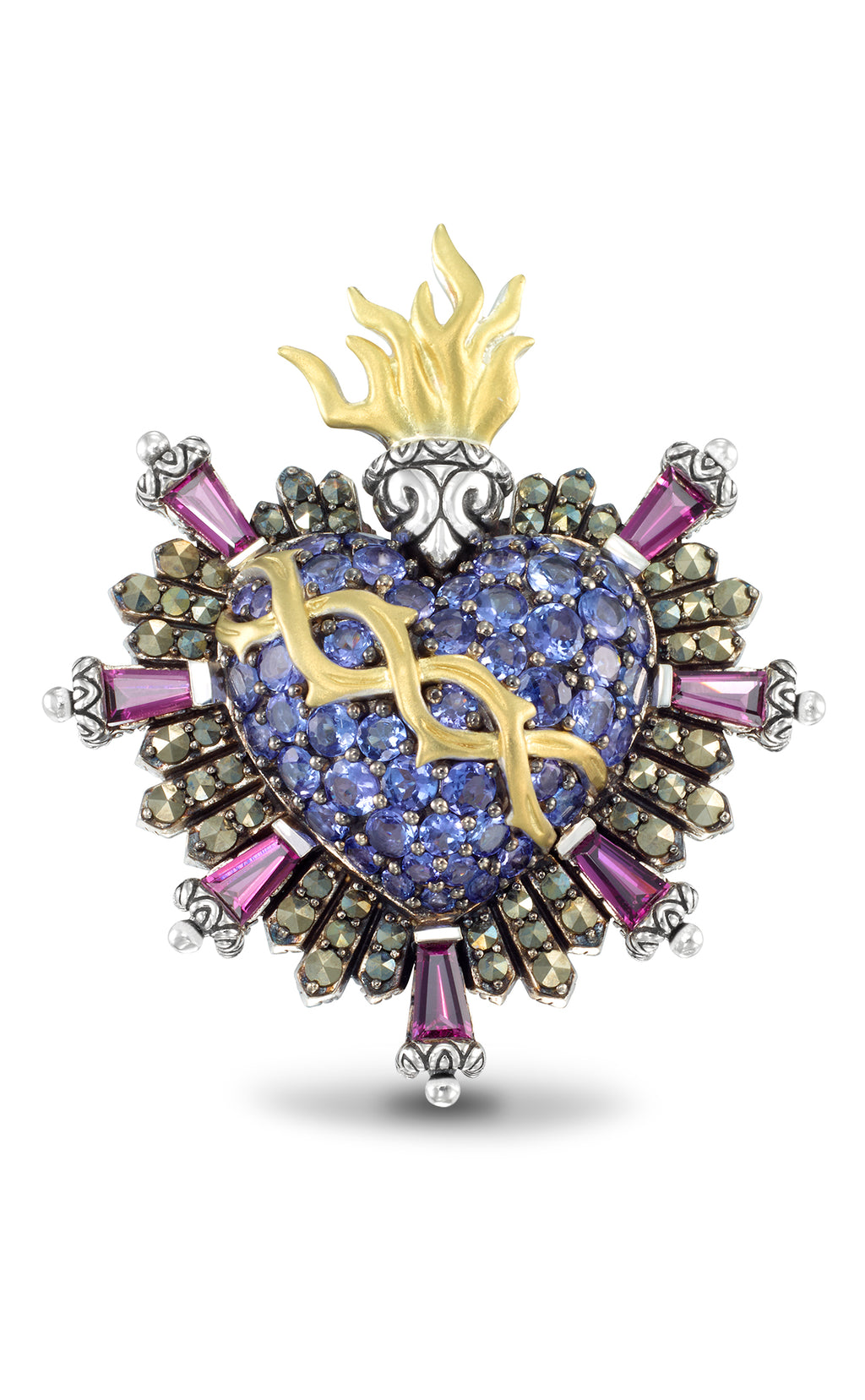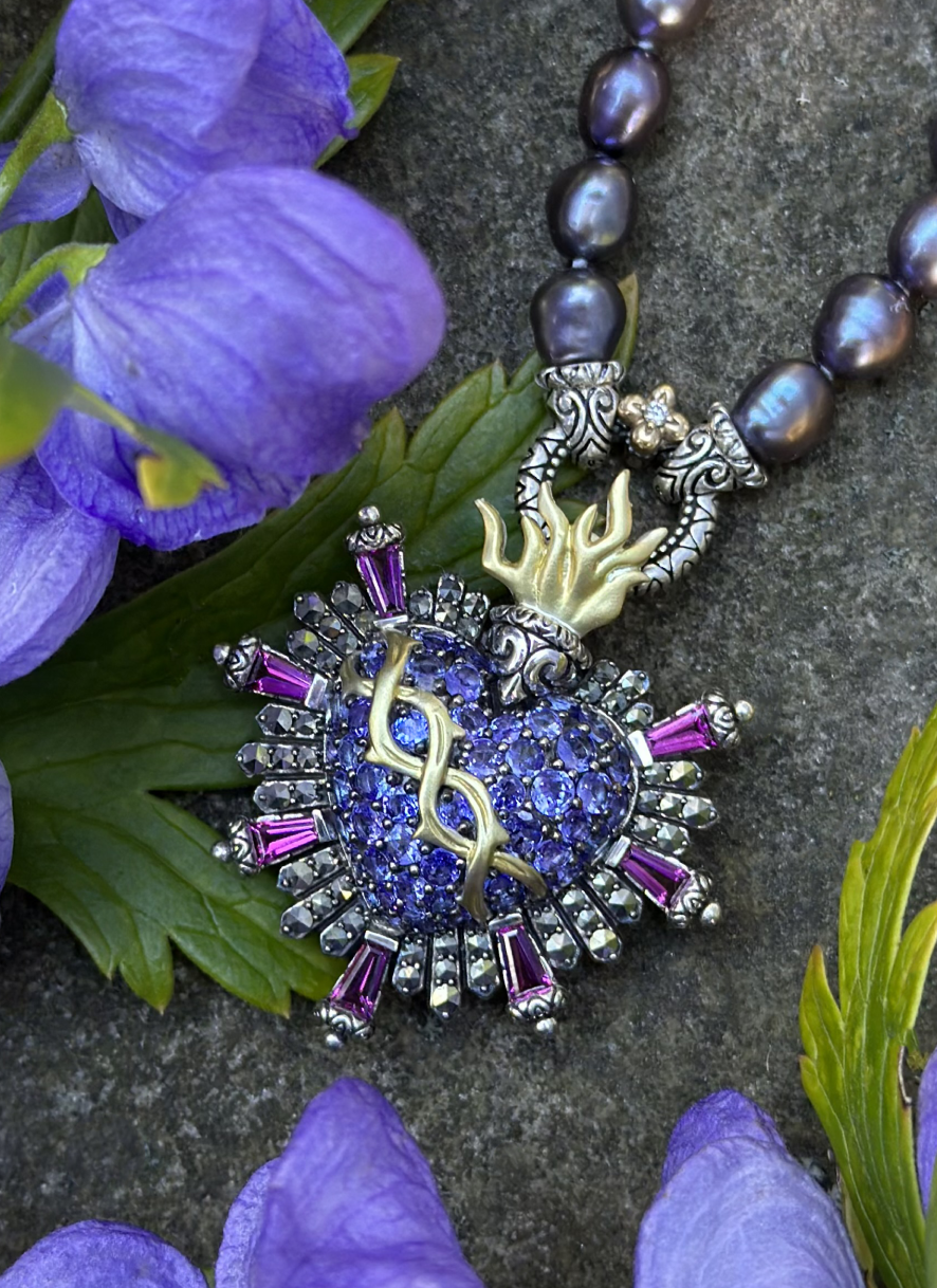 Sterling silver and 18K yellow gold, pink garnet, marcasite, and tanzanite Flaming Heart pendant from the Karma Works Collection. The pendant features a prong set pink tanzanite heart with 18K yellow gold thorn accent. A sterling silver lotus petal inspired carvings includes special cut pink garnet baguettes alternating with upside down marcasite points; 18K yellow gold flame with signature accents sits at the top of this incredible piece.
