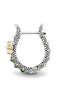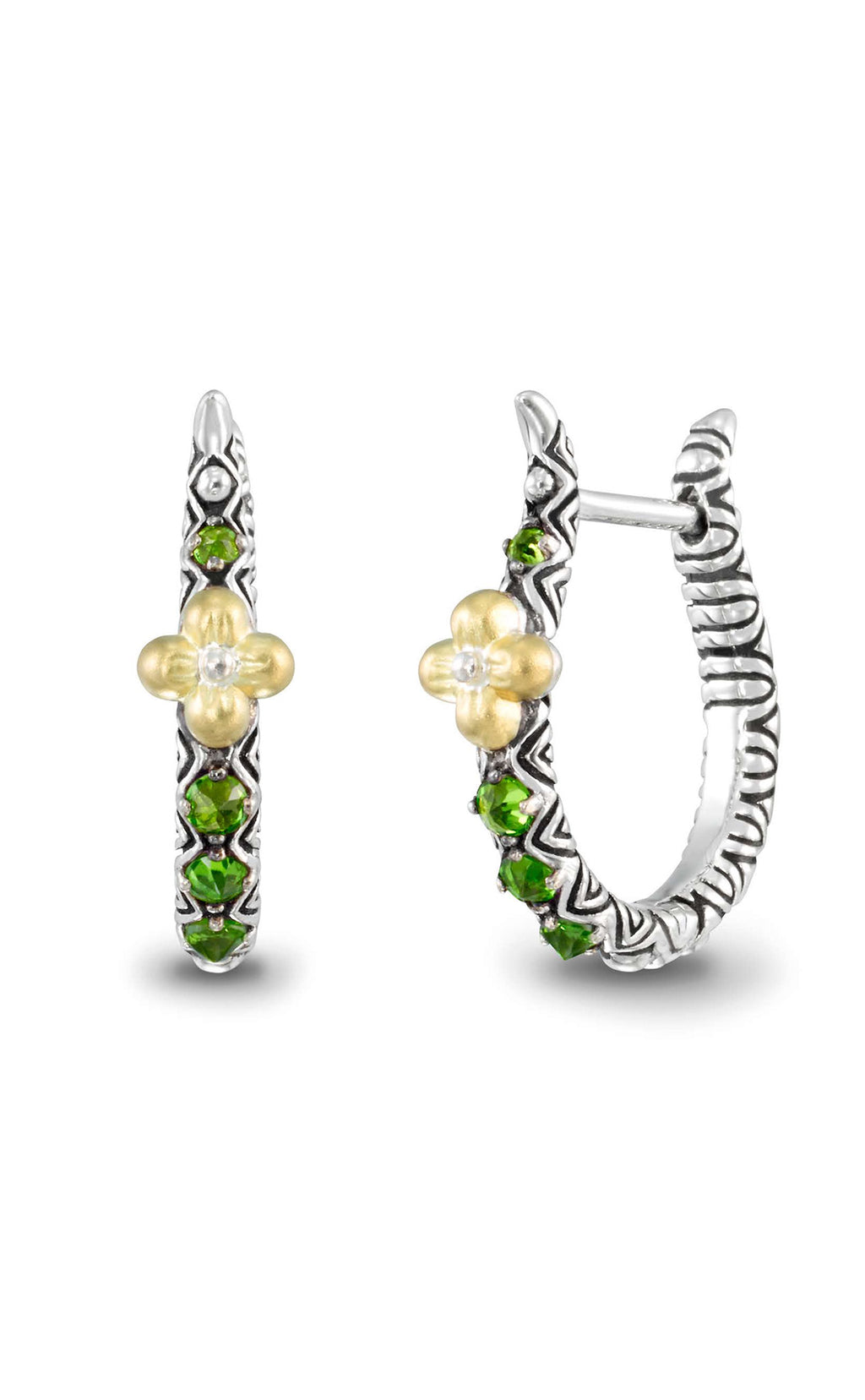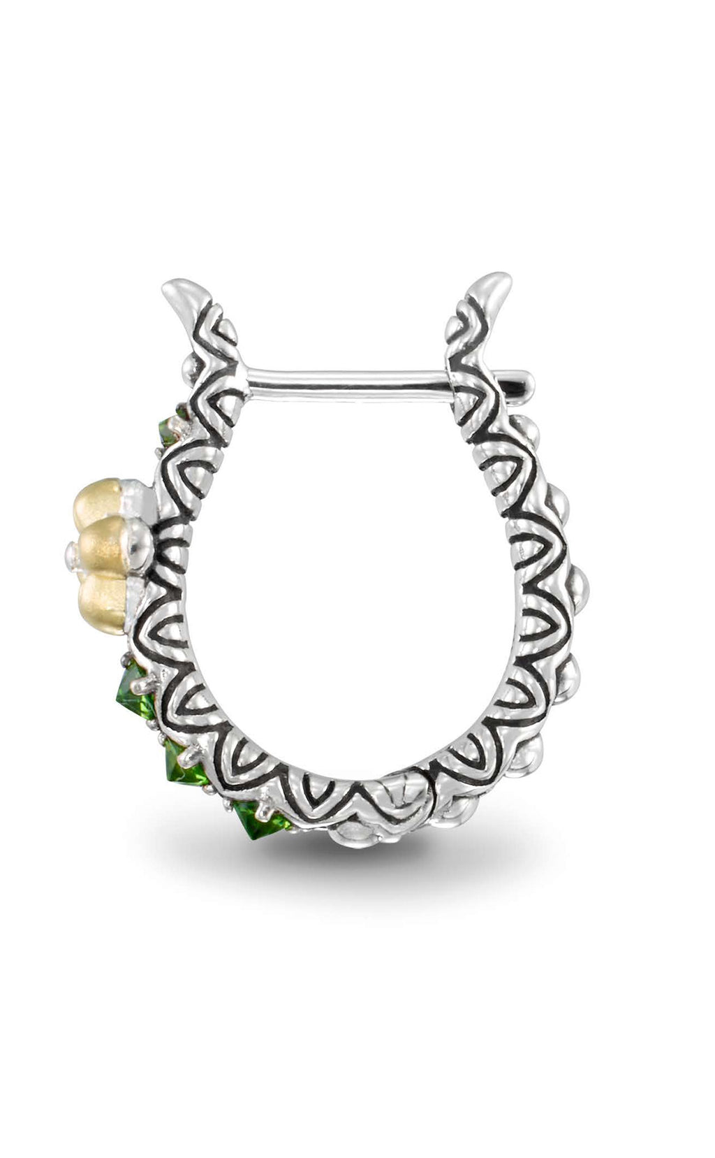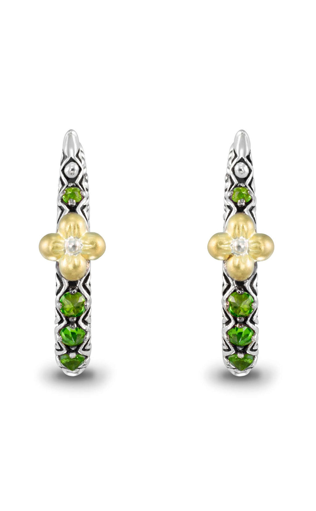 Sterling silver and 18K yellow gold hinged huggie hoop earrings featuring upside down set chrome diopside with 18K yellow gold signature flower and lotus petal inspired carvings.
