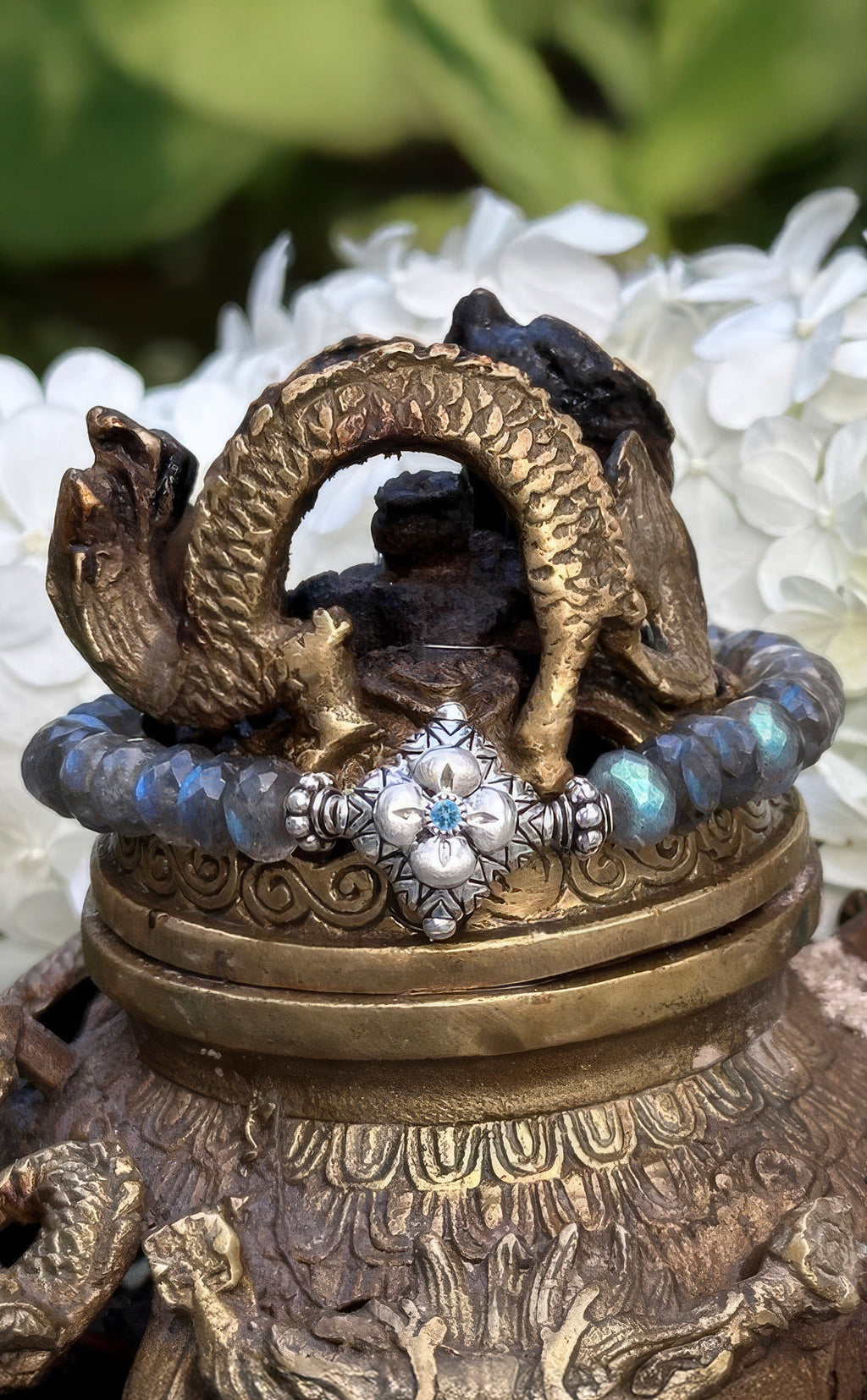 Sterling silver and labradorite bracelet features 5mm × 8mm faceted rondelle labradorite beads; sterling silver signature flower has blue topaz gemstone center set in granulated bezel with star motif with signature lotus petal inspired carvings; carved sterling silver bead accents on either side. Created in a universal size, this stretch bracelet offers both effortless elegance and comfortable wear.