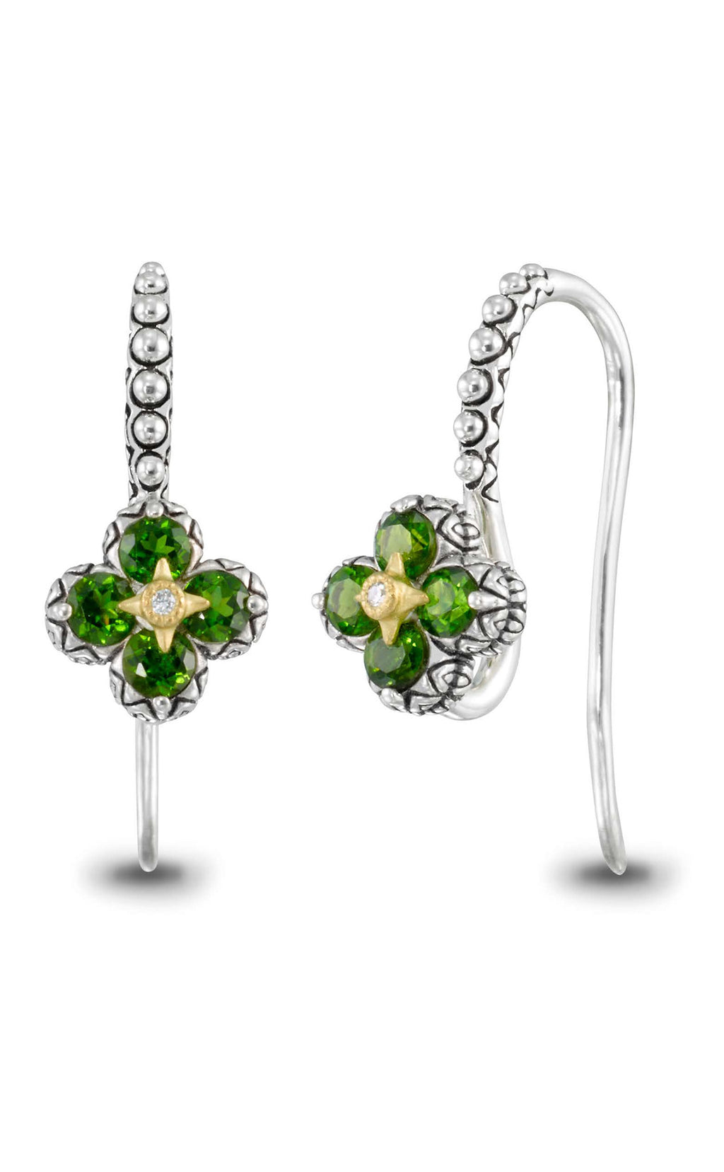 Sterling silver and 18K yellow gold shepherds hook earrings feature bezel-set round chrome diopside forming a lotus flower with 18K gold star and diamond center.