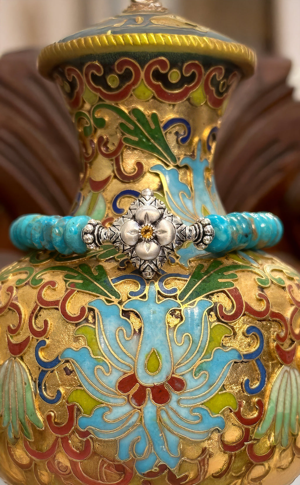 Sterling silver and turquoise bracelet features 8mm smooth rondelle sleeping beauty turquoise beads; sterling silver signature flower has citrine gemstone center set in granulated bezel with star motif with signature lotus petal inspired carvings; carved sterling silver bead accents on either side. Created in a universal size, this stretch bracelet offers both effortless elegance and comfortable wear.