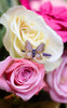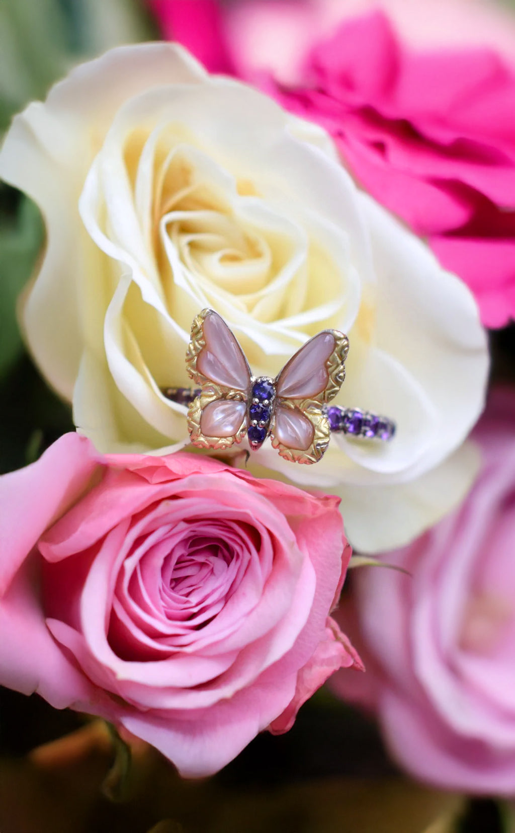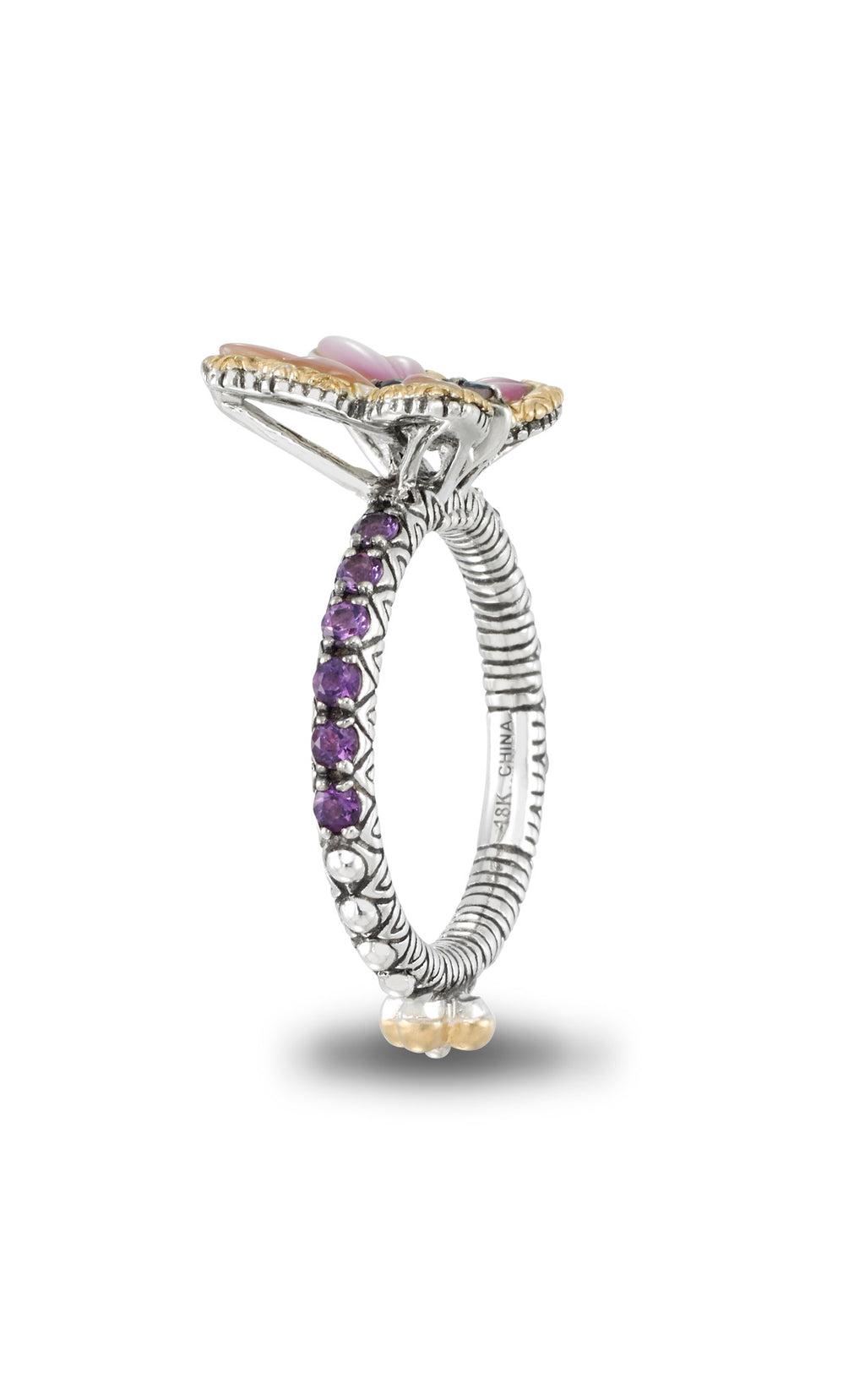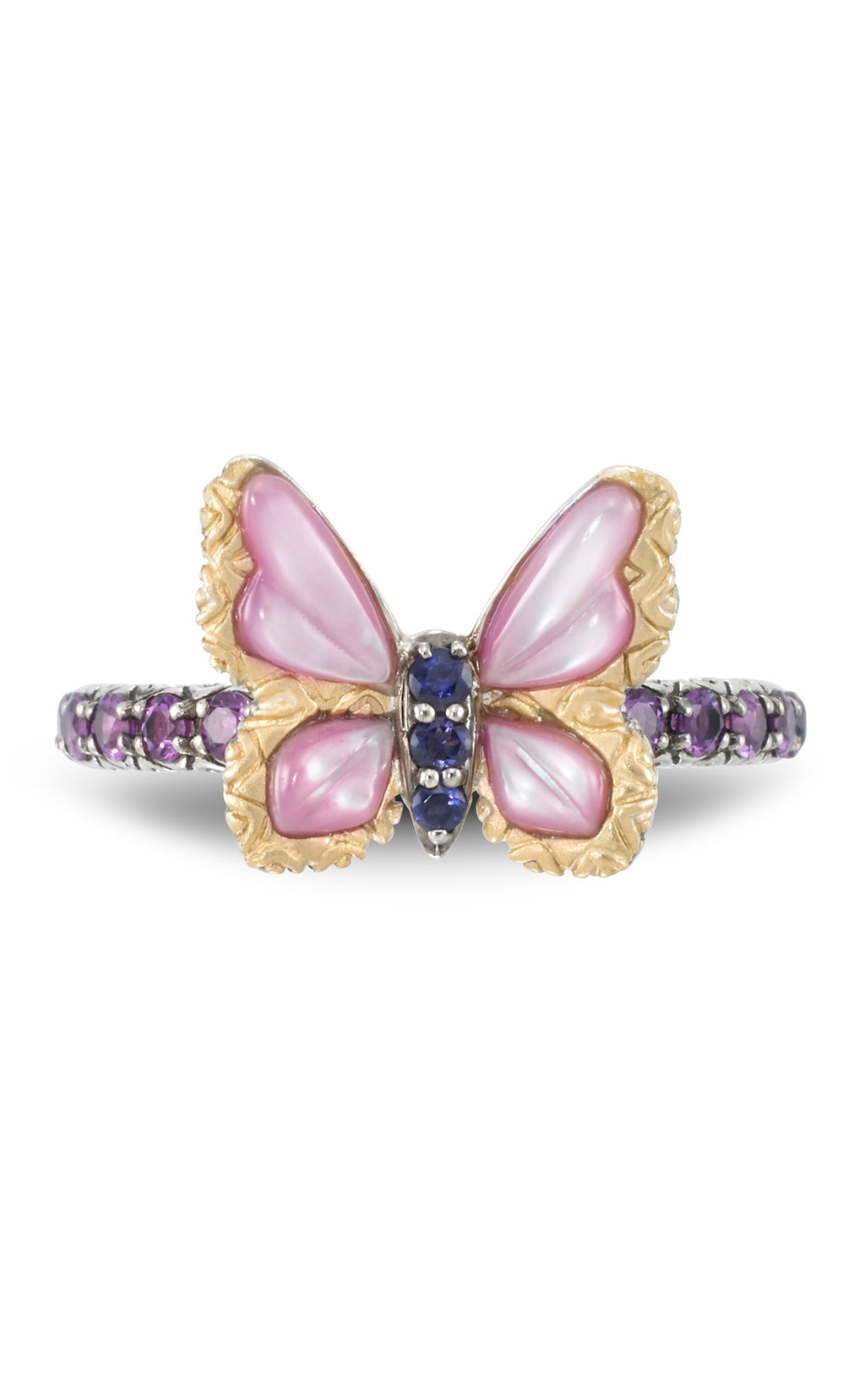 Sterling silver and 18K yellow gold pink mother of pearl, amethyst and iolite butterfly ring from the Zen Garden Collection. The ring features a carved pink mother of pearl butterfly with iolite body and 18K gold frame with lotus petal inspired carving; prong-set amethyst on the shank; 18K gold signature flower on the back of the ring.