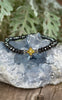 Sterling silver, 18K yellow gold, hematite, and citrine bracelet centers around a luminous citrine signature flower, highlighted by an 18K gold star-set diamond at its center. Striking 6mm faceted rondelle hematite beads and finely carved sterling silver bead accents on each side enrich the design with refined detail. Created in a universal size, this stretch bracelet offers both effortless elegance and comfortable wear.