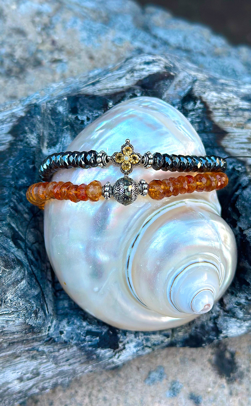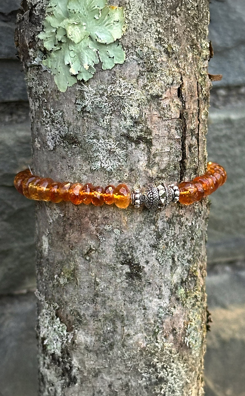 Sterling silver, citrine and hematite bracelet features stunning 6mm faceted rondelle citrine beads. At the center rests a sterling silver bead paved with silver hematite adding a vivid touch of sparkle. Finely carved sterling silver bead accents on each side enhance the artistry of the design. One size fits all stretch bracelet. Created in a universal size, this stretch bracelet offers both effortless elegance and comfortable wear.