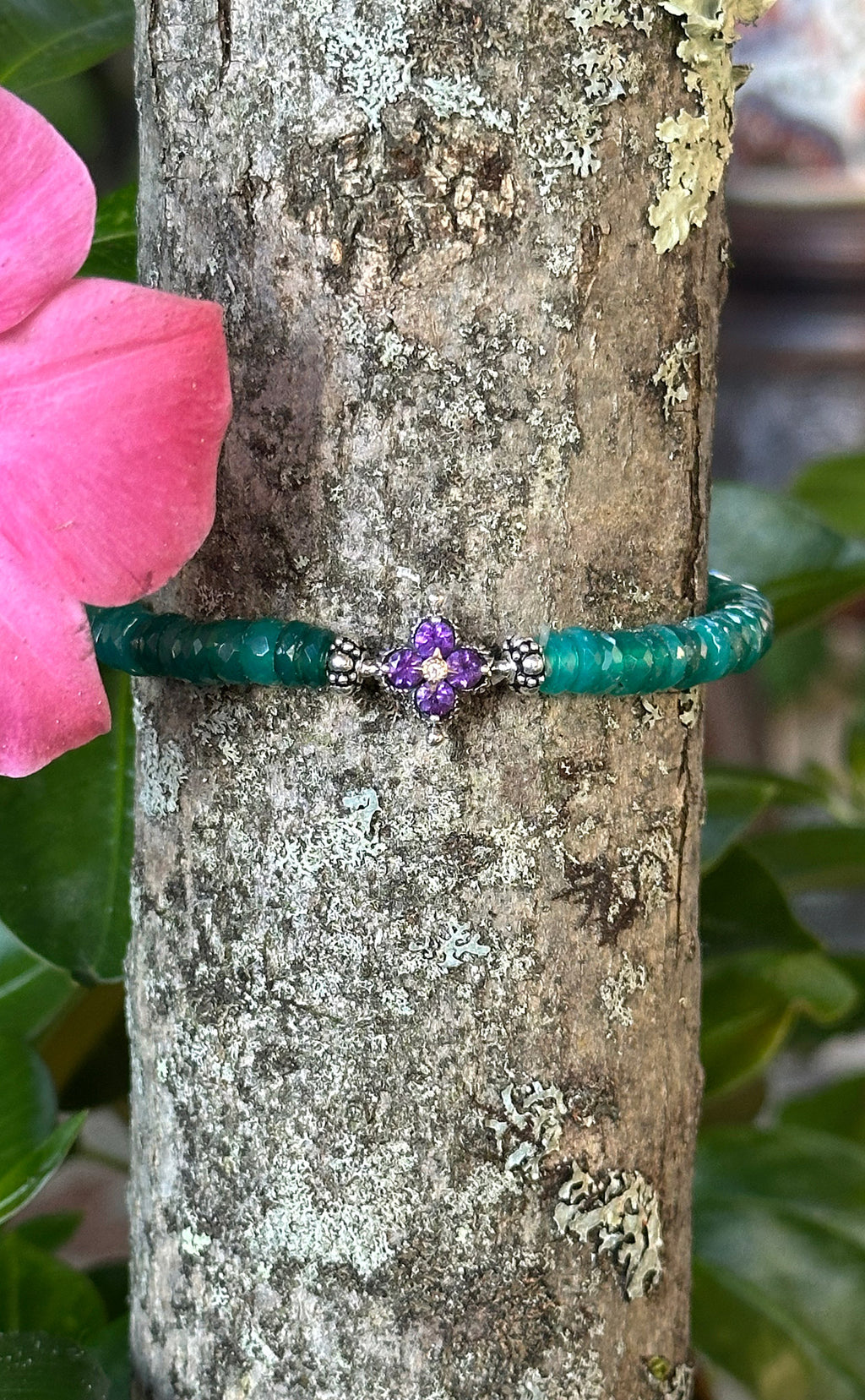 Sterling silver, 18K yellow gold, green onyx, and amethyst bracelet centers around a brilliant amethyst signature flower, highlighted by an 18K gold star-set diamond at its center. Glowing 6mm faceted rondelle green onyx beads and finely carved sterling silver bead accents on each side enrich the design with refined detail. Created in a universal size, this stretch bracelet offers both effortless elegance and comfortable wear.