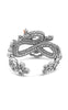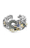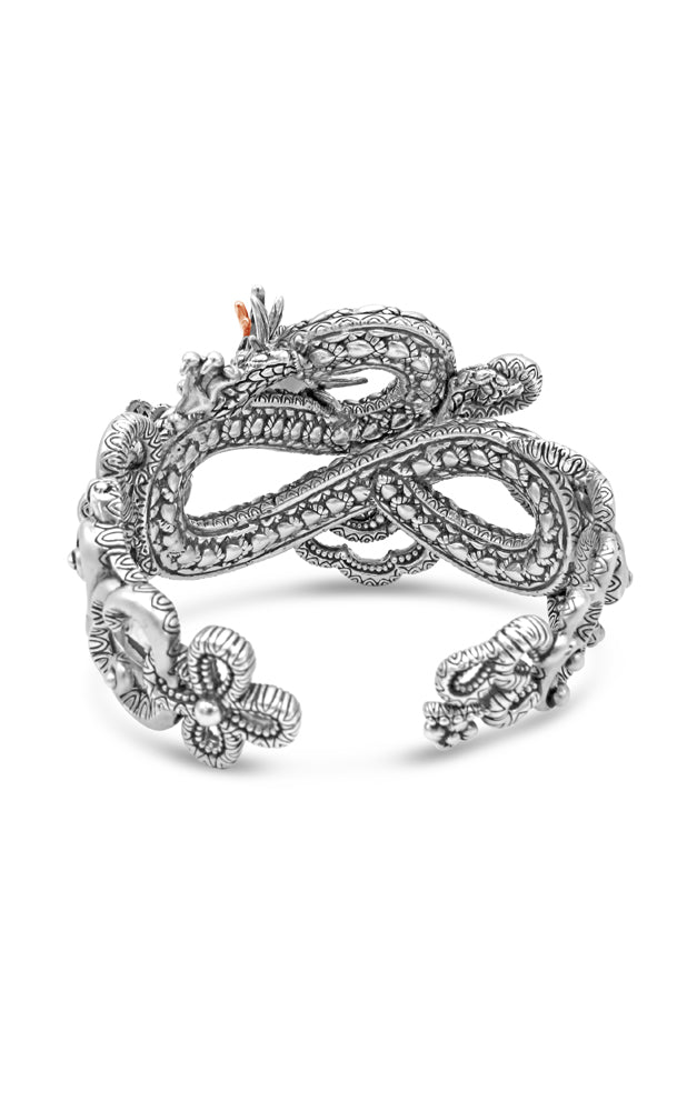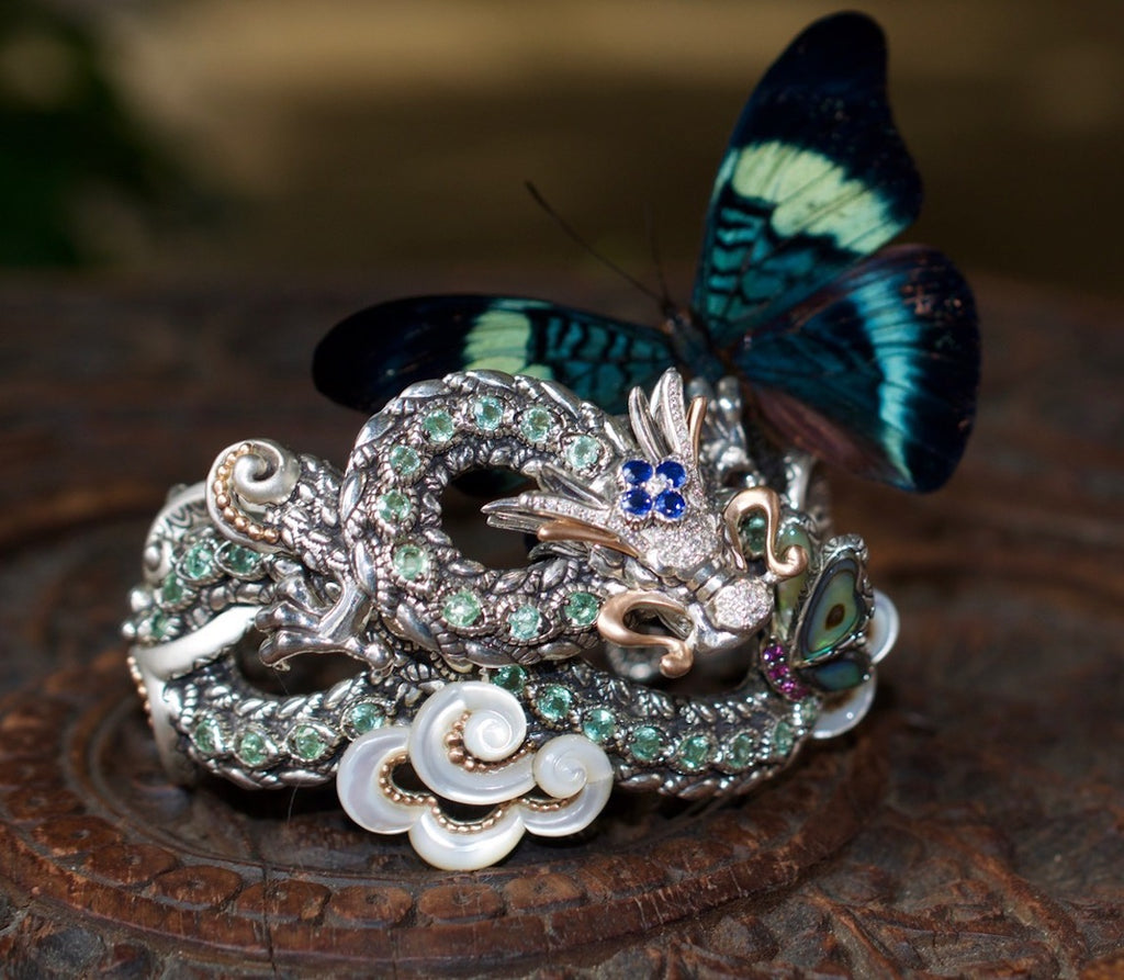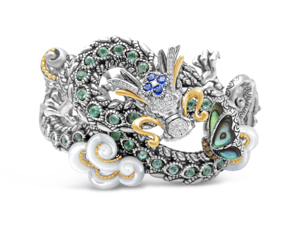 Sterling silver and 18K yellow gold Limited Edition dragon bracelet from the Karma Works Collection. Bracelet features prong set diamonds covering the head and horns with signature carvings and 18K gold accents; kyanite signature flower with diamond center on forehead; reverse wave white mother of pearl and 18K yellow gold granulation; abalone and pink garnet butterfly; gorgeous prong set mint kyanite covers the body of the dragon. Hinge closer.