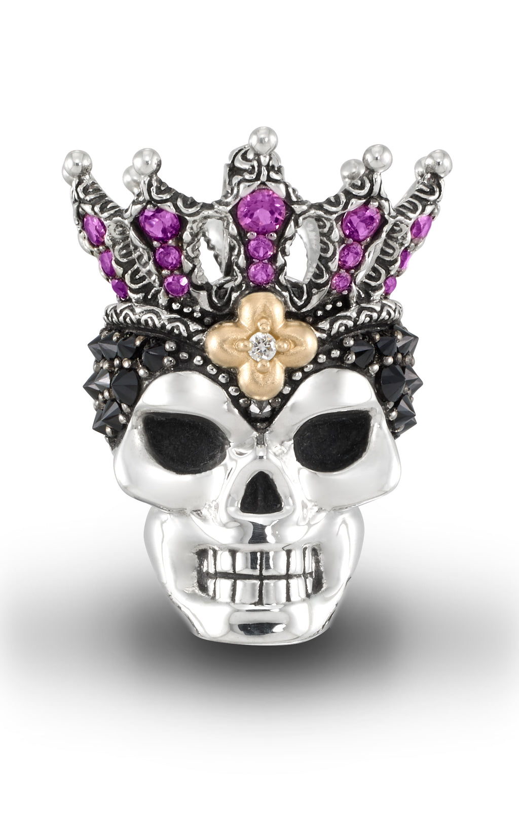 Sterling silver and 18K yellow gold wicked queen skull charm from the Roses Never Die Collection. Charm features crown in glowing amethyst and upside-down black spinel; 18K yellow gold signature flower on forehead with diamond center.