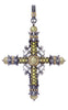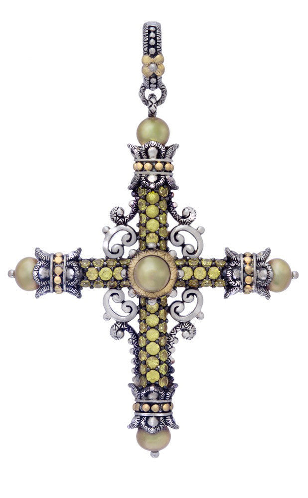 This beautiful cross pendant features bead-set yellow sapphires set down and across the pendant, with olive fresh water pearls at the center and four points. The center is surrounded by sterling silver and 18K gold bead accents.