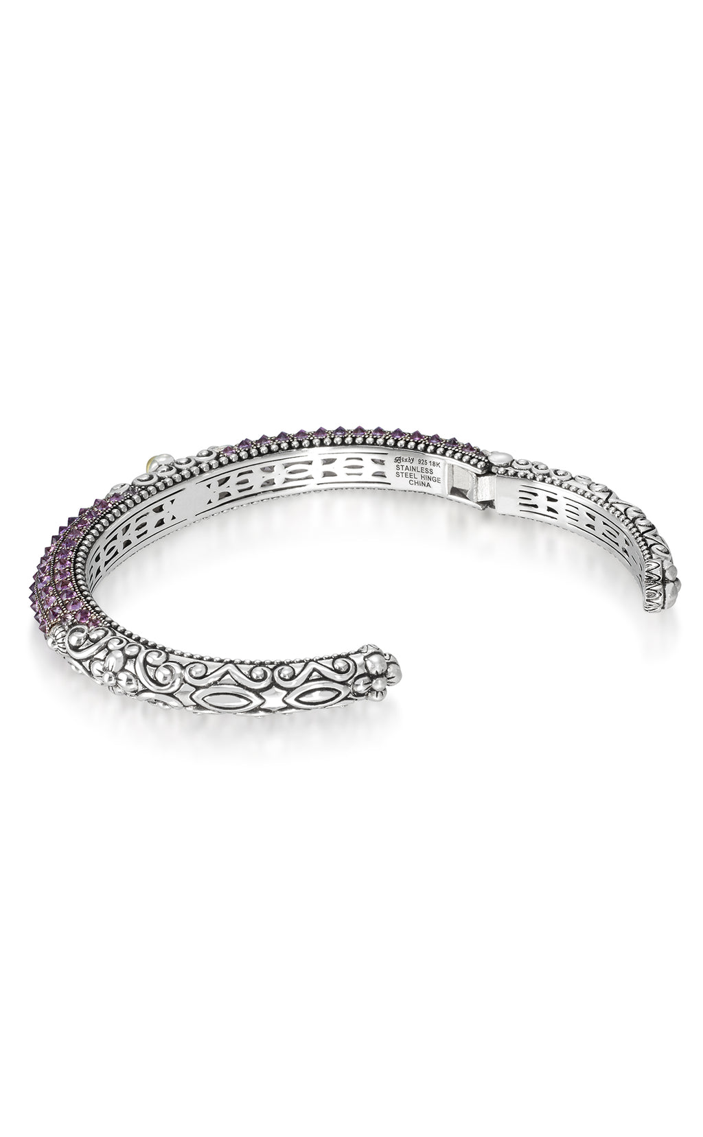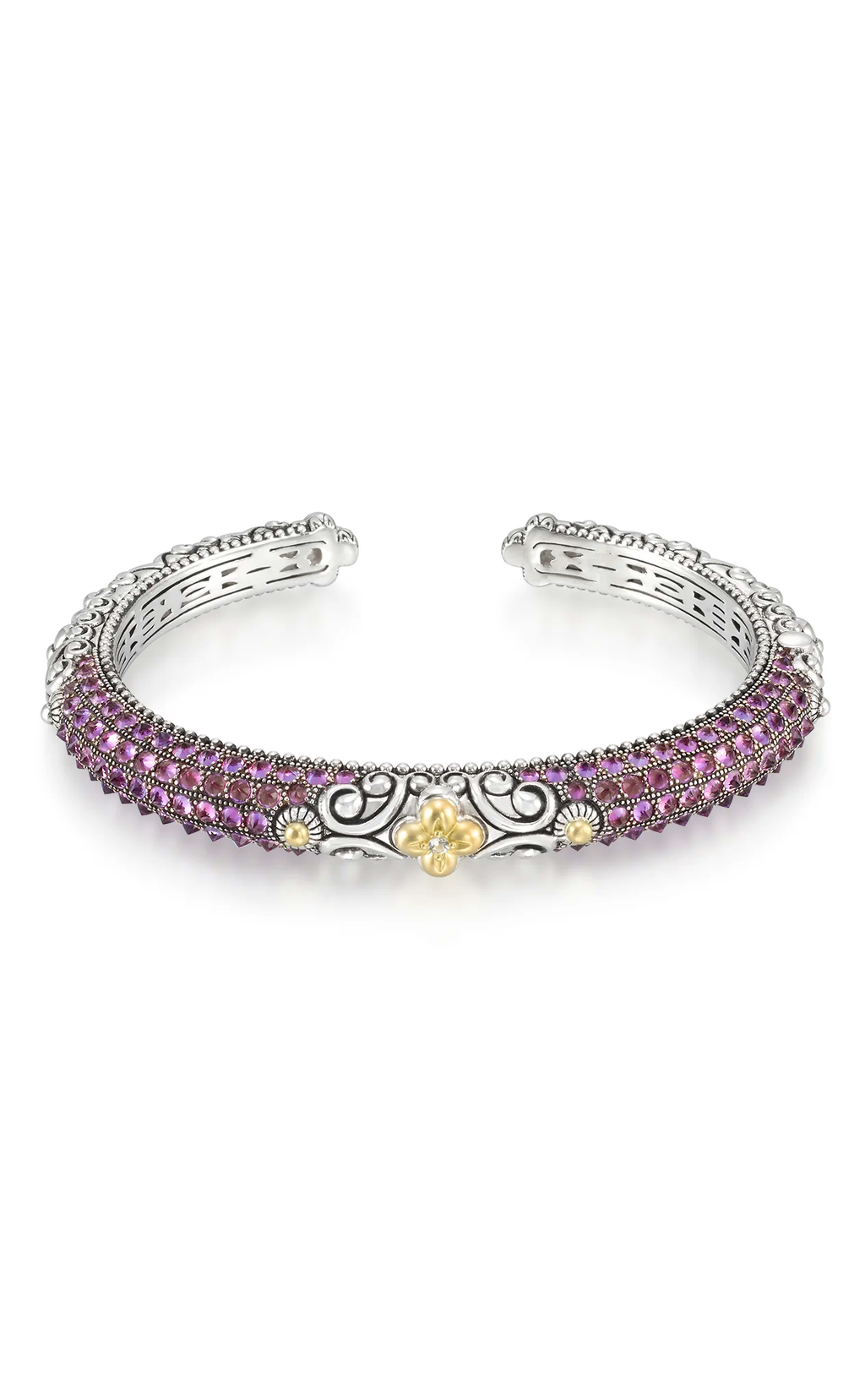 Upside down amethyst sparkles with 18K yellow gold signature flower and white topaz stationed in the center; signature carvings and 18K gold beads on either side.