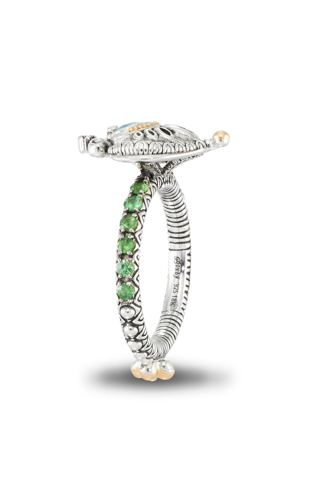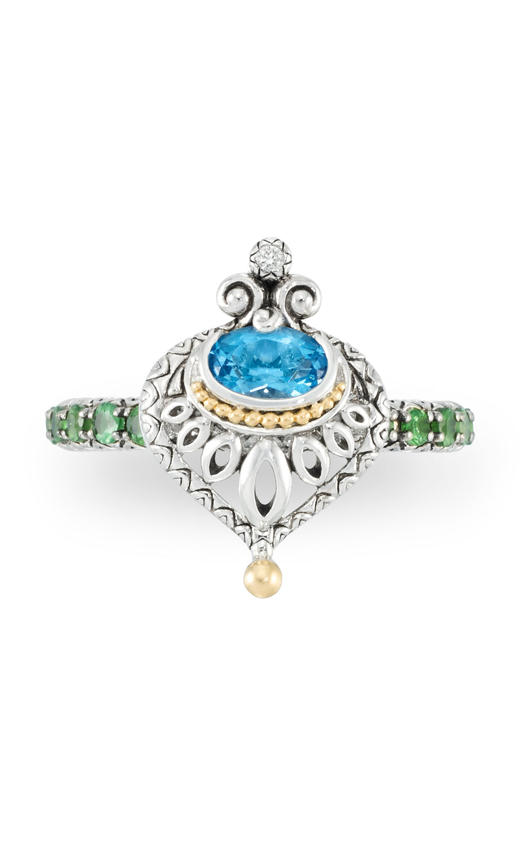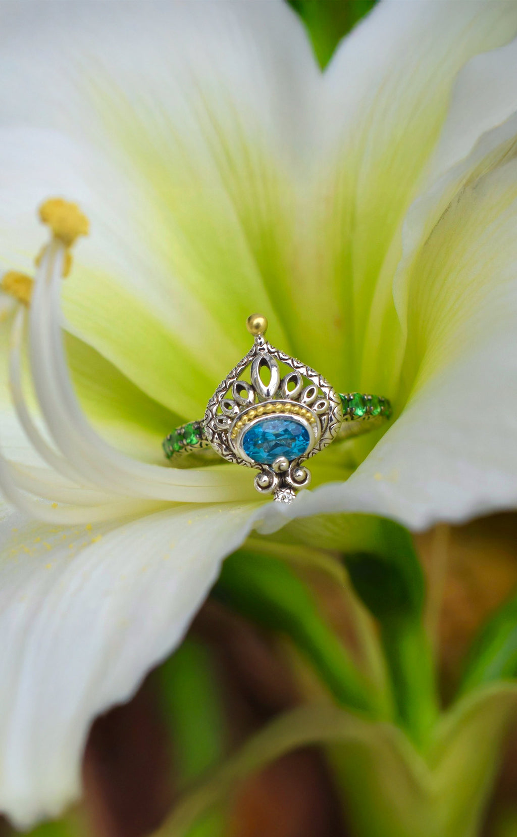 Sterling Silver and 18K yellow gold, diamond, blue topaz and tsavorite peacock ring from the Karma Works Collection. Ring features special cut oval blue topaz center stone set with 18K gold detailed border; signature lotus petal inspired carvings; round diamond sits at the top and an 18K gold round bead at the bottom; prong set tsavorite stones on the shank. 18K gold signature flower on the back of the ring.