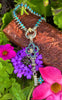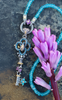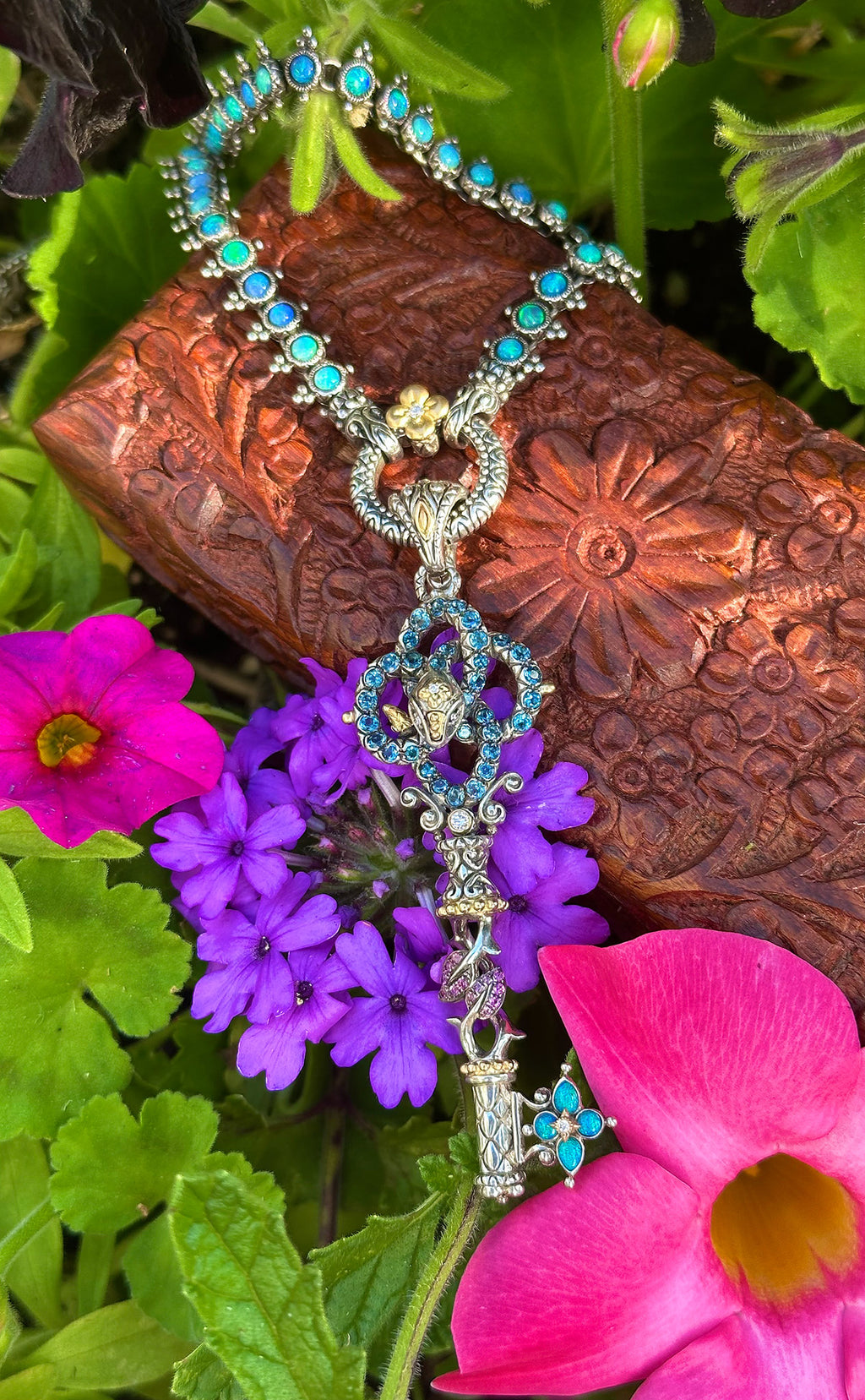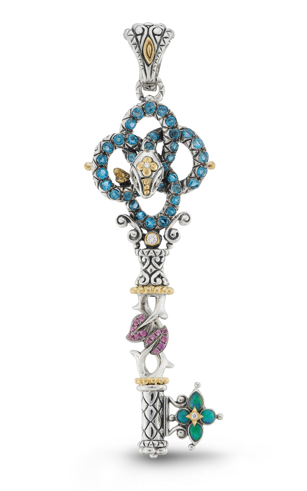 Sterling silver and 18k yellow gold key pendant from the Zen Garden Collection. The key features a London blue topaz snake crowned with an 18k yellow gold signature flower and diamond center. A bezel-set diamond sits below, followed by pavé rhodolite leaves flanked with 18k yellow gold beads, and an opal signature flower with a diamond center.