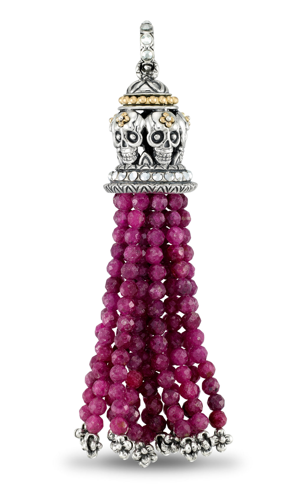 Sterling silver and 18K yellow gold Skull tassel from the Roses Never Die Collection. Tassel features ruby beads with signature flowers on ends; skulls with 18K yellow gold signature flowers; 18K yellow gold bead accents on the cap; upside down hematite accents and detailed carvings on cap and bail.