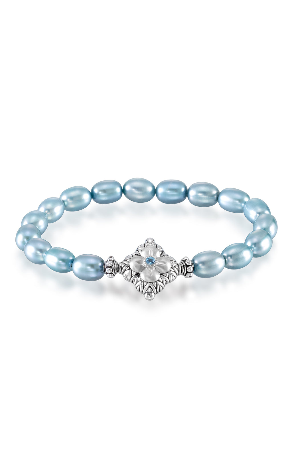 Sterling silver and glacier blue pearl bracelet features 8mm blue pearls; sterling silver signature flower with star set blue topaz gemstone center with signature lotus petal inspired carvings and sterling pebble bead accents on either side. Created in a universal size, this stretches bracelet offers both effortless elegance and