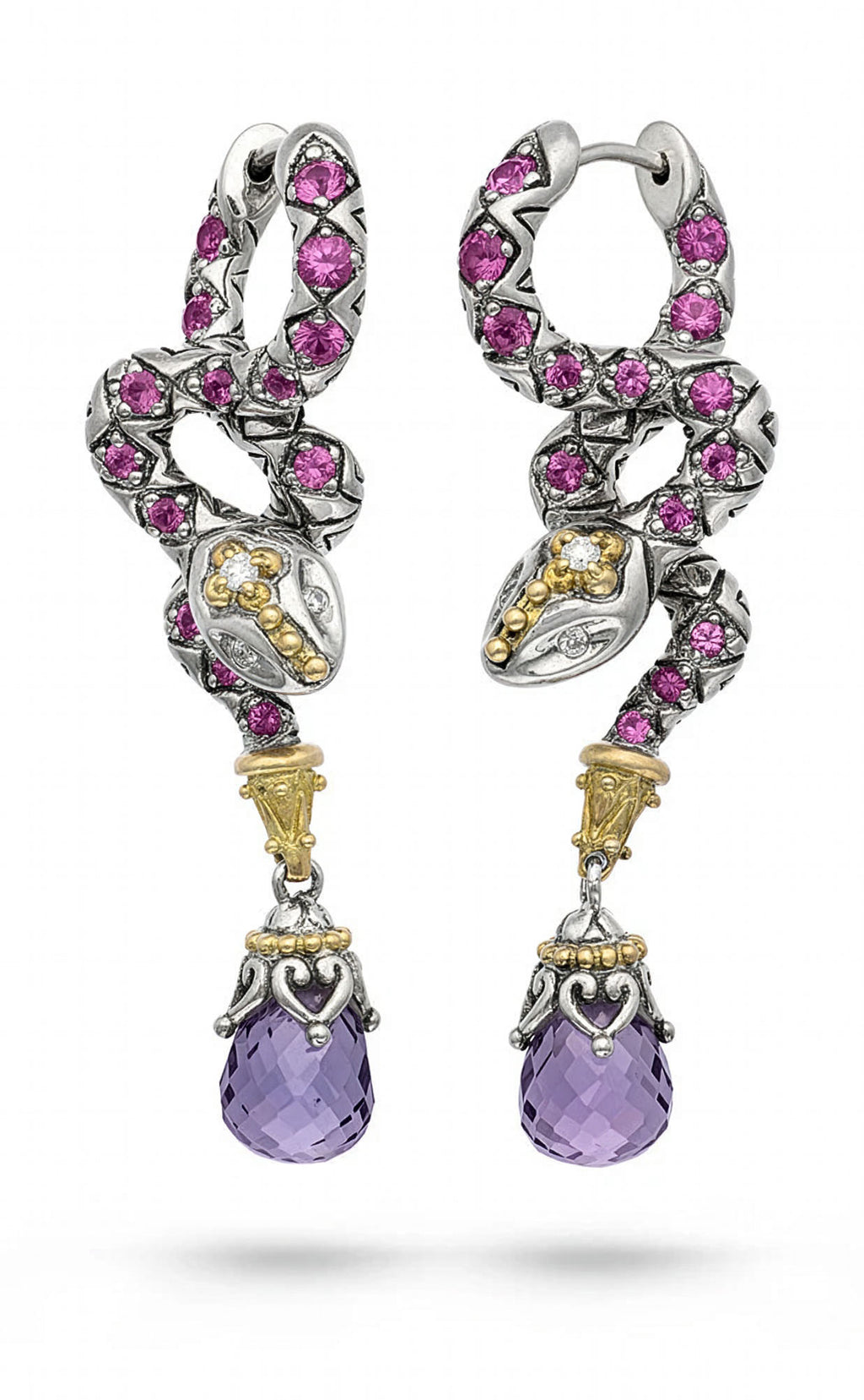 Sterling silver, 18k yellow gold, diamond, pink sapphire, and Rose de France drop earrings from the Zen Garden Collection. These faceted snake earrings feature prong-set pink sapphires along the body of a snake that wraps gracefully around the ear. The head is detailed with 18k yellow gold beads, a signature 18k gold flower with a diamond center, and diamond eyes. The tail connects to a Rose de France drop, tipped in 18k gold.
