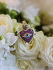 Sterling silver and 18K yellow gold and amethyst Flaming Heart Eye ring from the Karma Works Collection. The ring features pave-set amethyst heart with signature 18K yellow gold lotus petal inspired carvings framing the heart. 18K gold eye with turquoise and black center framed in 18K yellow gold ; 18K yellow gold flame sits at the top. The shank has beautifully detailed roses and 18K gold leaves; finished with an 18K gold signature flower.