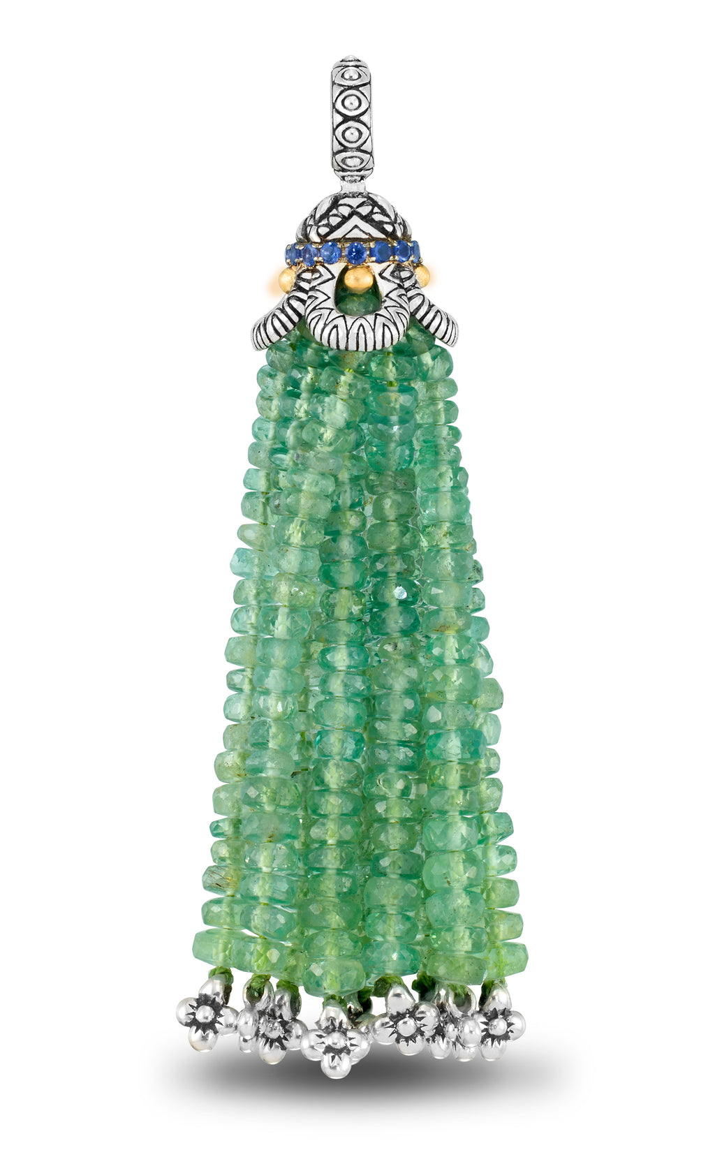 Sterling silver and 18K gold tassel from the Karma Works Collection. Tassel features strands of mint kyanite beads finished with dangling sterling silver signature flowers; 18K yellow gold bead detail, signature carvings and pave set iolite finish the tassel cap.