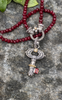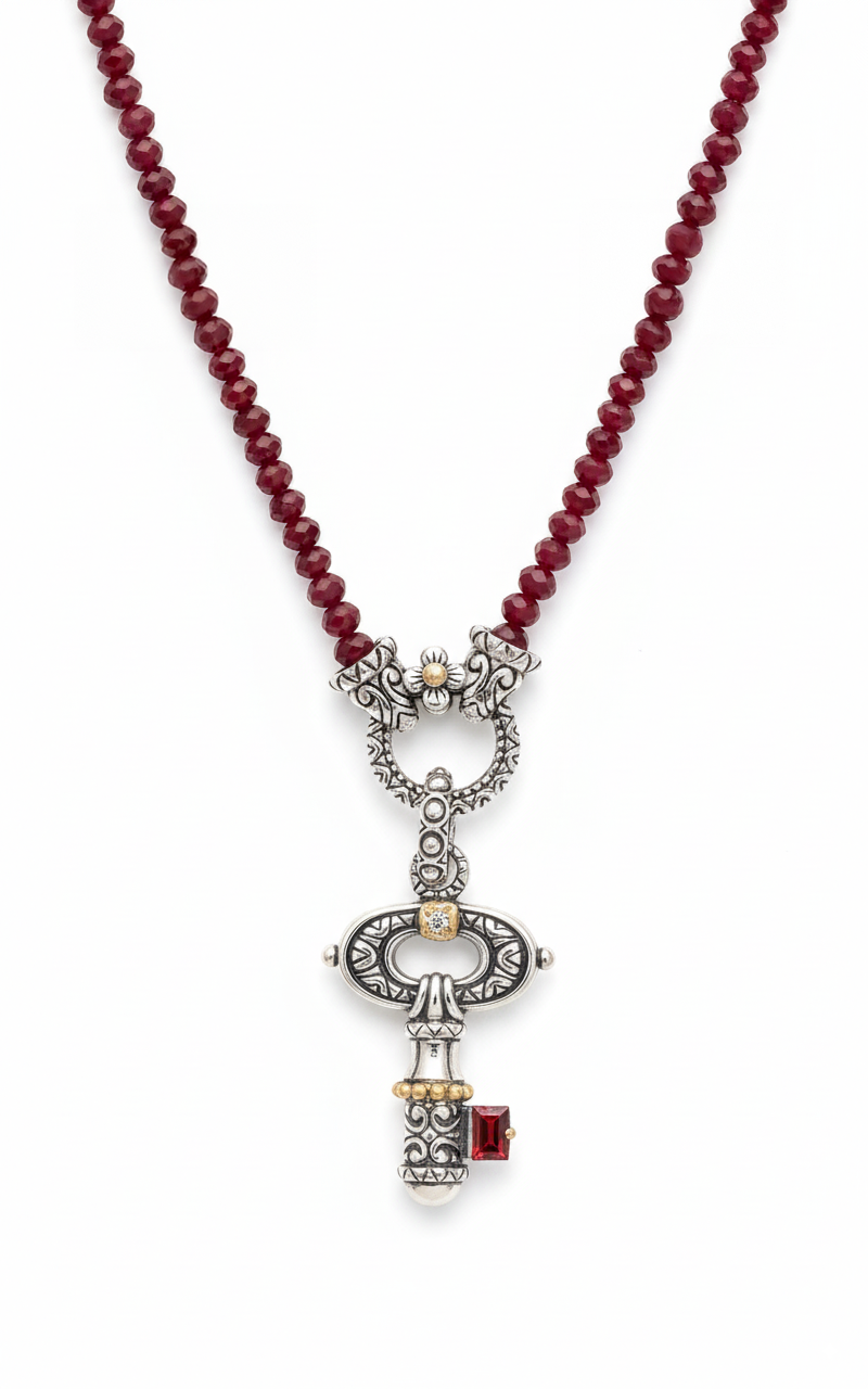 Sterling silver and 18k yellow gold key charm necklace. The key is accented with prong-set diamonds, channel-set garnets, and intricate scroll and lotus petal–inspired carvings. 18k yellow gold highlights add depth throughout. The mini opening circle features the signature flower with an 18k gold center. The pendant hangs from an 18” wine-red jade beaded necklace with sterling silver end caps. Comes complete with a mini circle clasp and beaded necklace.