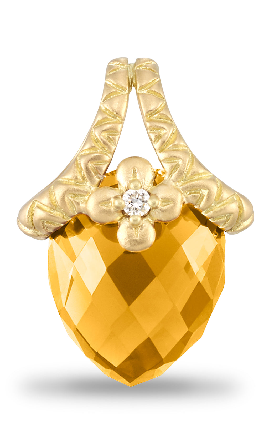 18K yellow gold and diamond mini briolette charm from the Golden Palace Collection. The charm features a special cut citrine briolette; lotus inspired carving and signature flower with diamond center.