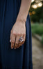 Sterling silver and 18K yellow gold Pansy Ring featuring lotus petal inspired carvings. Pink mother-of-pearl and pavé pink amethyst petals sit alongside pavé pink garnet petals bordered in 18K gold. At the center rests a bezel-set iolite surrounded by 18K yellow gold.