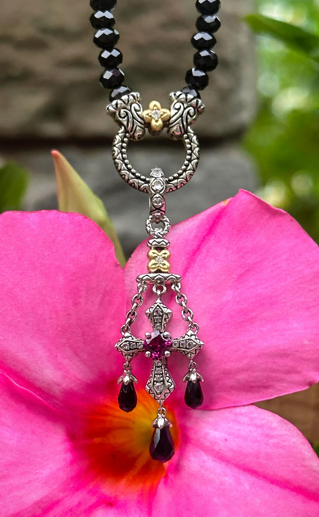 Sterling silver and 18K gold, black spinel beaded necklace from the Signature Collection. The necklace features 4 mm faceted  black spinel beads on sterling silver end caps. Available in 16", 18"or 20". The necklace needs to be worn with open circle clasp. Sold separately.