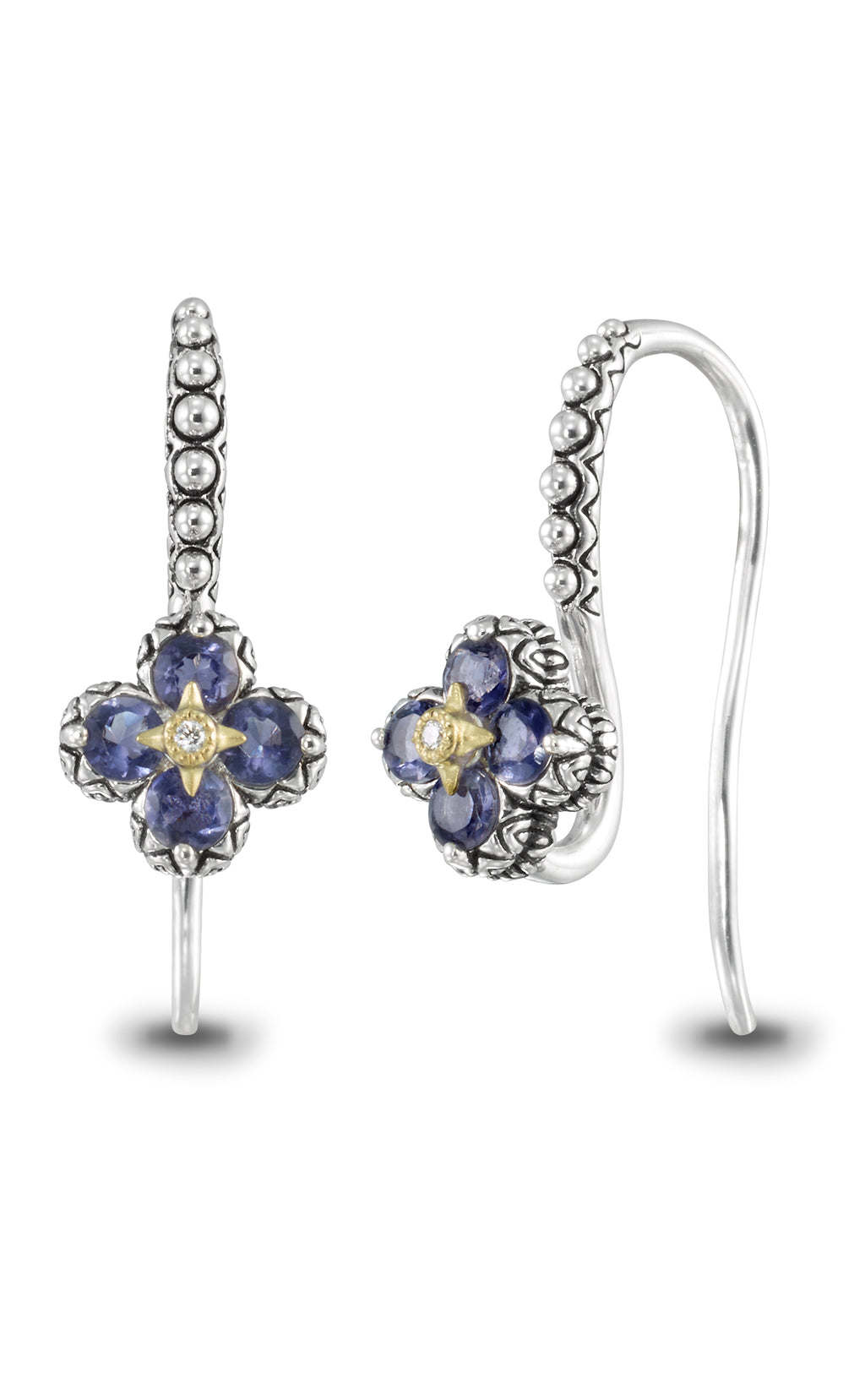 Sterling silver and 18K yellow gold shepherds hook earrings feature bezel-set round iolite forming a lotus flower with 18K gold star and diamond center.